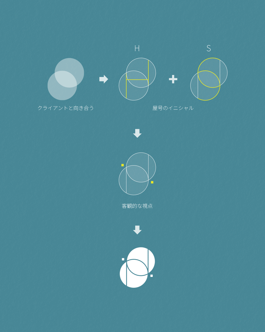 人に見立てた円が向き合っているなかから、イニシャルのHとSを想起させる線を引き、客観的な視点に見立てた点をあしらいに入れています。